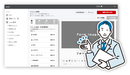 あらかじめ用意された項目をドラッグ&ドロップで並べて、フォームをかんたんに作成することができます。